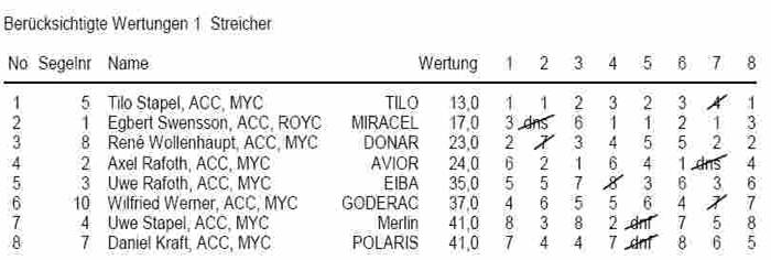 dieses Jahr schön einfach! Jede Yacht erhielt die Punkte für den ersegelten Platz mit einer Streichung |